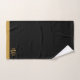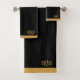 Personalisiertes elegantes Monogramm 3 Erstgold-Script schwarzes Badetuch-Set mit goldenem Rand. Die Badezimmer sind mit einem minimalistischen typografischen Stil dekoriert.