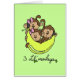 Drei entzückende kleine Affen hängen heraus in der Biegung einer großen gelben Banane auf 3 Li'l Affe-T - Shirts, Bodysuits, Karten, Aufklebern, Taschentaschen und anderen Affekleidungs- und -geschenkeinzelteilen.