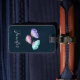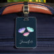Gepäckanhänger mit hübschem Design. 3 Schmetterlinge in Aquarellfarbe, rosa, lila und grün gestrichen. Dunkelblauer Aquarellhintergrund.