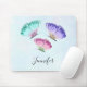 Mousepad mit hübschem Design. 3 Schmetterlinge in Aquarellfarbe, rosa, lila und grün gestrichen. Ein hellblauer Aquarell mit Hellrosa.