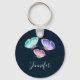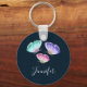 Ein Schlüsselanhänger mit hübschem Design. 3 Schmetterlinge in Aquarellfarbe, rosa, lila und grün gestrichen. Dunkelblauer Aquarellhintergrund.