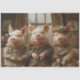 Das passende Business-Trio von Schweinen, die Wärme und Gemütlichkeit in jeden Raum bringen, den sie lieben. Sie sind in menschlicher Kleidung verkleidet und liegen auf einem gemusterten Sofa, das so einladend wie ihre charmante Firma ist. Das mittlere Schwein mit seinem rot-weiß gestreiften Hemd und seinen Aufhängern strahlt ein spielerisches Ambiente aus, während die Geschwister auf beiden Seiten, mit Jacken und Hüten versehen, einen Hauch von Eleganz verleihen. Die Vintage-Lounge mit eingerahmten Bildern und Nostalgie bildet den perfekten Rahmen für ihre liebenswerte Antiquitäten.