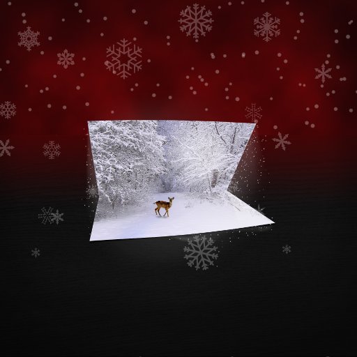 "Snowy Dreams" ist eine 3D-Illustration mit einer Karte im 3D-Effekt - eine Waldwinterszene mit einem Hirsch in der Mitte. Die Grußkarte ist auf dunkelrot-grauem Hintergrund mit Schneeflocken.