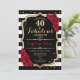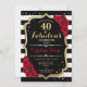 40. Geburtstag Einladung Elegantes Schwarz-weißes Design mit Imitat Glitzer. Schwarzweißstreifen mit rote Rosen. Ideal für eine elegante Geburtstagsfeier.