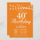 40. Geburtstag Einladung mit String Lights. Orange Hintergrund. Männer oder Frauen zum Geburtstag. 13. 15. 16. 18. 20. 21. 30. 40. 50. 60. 70. 80. 90. 100. Jedes Alter. Für weitere Anpassungen klicken Sie bitte auf die Schaltfläche "Anpassen" und verwenden Sie unser Designwerkzeug, um diese Vorlage zu ändern.
