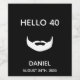 Ein modernes Weinflaschenlabel für ein 40. Geburtstagsgeschenk für Typ in Schwarz und Weiß. Mit dem Text: Hallo 40. Mit einem Bild von einem Bart. Vorlagen für Namen und Datum. Schwarze Hintergrundfarbe
