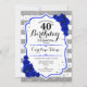 40. Geburtstag Einladung. Elegantes Design in Imitaten Glitzer silber, weiß und königsblau. Das stilvolle Skript-Fort, Streifen und blaue Rose. Ideal für eine elegante Geburtstagsfeier. Kann in jedem Alter angepasst werden.