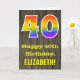 Die Vorderseite dieser bunten, aber rustikalen Geburtstagskarte zeigt eine große Zahl "40" mit einem inspirierten Regenbogenspektrum. Es enthält auch die Meldung "Happy 40 th Birthday", und einen benutzerdefinierten Empfänger-Namen. Die Vorderseite ist mit einem Hintergrund versehen, der ein rustikales Imitat mit inspiriertem Holzkorn darstellt. Im Inneren befindet sich eine benutzerdefinierte Geburtstagsgrüßbotschaft, oder man könnte sie löschen und leer verlassen werden, wenn eine Nachricht von Hand geschrieben werden soll. Eine individuell gestaltbare Geburtstagskarte wie diese könnte eine lustige Art sein, jemandes vierzigsten Geburtstag zu feiern. [~Z0000419]