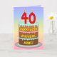 This upbeat and joyful birthday greeting card design features a cartoon-style depiction of a three-tier birthday cake having number-shaped candles on top showing the age “40“, along with the message “HAPPY 40TH BIRTHDAY,”, and a personalized recipient name. The background of the front features a multicolored pastel rainbow spectrum inspired gradient pattern. The inside features an editable birthday greeting message, or could perhaps be cleared and left blank if a message is to be written by hand instead. A colorful, personalized birthday greeting card like this might be used to acknowledge somebody’s fortieth birthday. [~Z0000625]