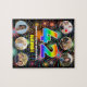 Dieses optimistische und kühn gestaltete Geburtstagsjigsaw-Puzzle-Design zeigt die Zahl "42" mit einem farbenprächtigen Regenbogenspektrum inspiriert Farbverlaufsmuster, zusammen mit der Meldung "HAPPY 42. BIRTHDAY" und einem individuelle Name, auf einem bunt platzierten feierlichen Feuerwerk inspiriert Muster. Oben und unten sind Bilder, die individuell angepasst werden können, vielleicht mit Fotos des Empfängers und/oder der Familie und Freunden des Empfängers. Ein spannendes, personalisiertes Geburtstagsjigsaw-Puzzle wie dieses könnte eine lustige Art sein, jemandem, der seinen zweiundvierzigsten Geburtstag feiert, eine Geburtstagsgrüßbotschaft zu übermitteln. (Fotografie © Storytree Studios, Stanford, CA.) [~Z000664]