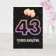 Party Ballons und Konfetti auf schwarzem Hintergrund mit der Neonnummer 43 für einen 43. Geburtstag.