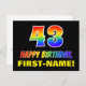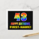 Die Vorderseite dieses bunten, lustigen und fröhlichen Geburtstags-Thema Postkartendesign zeigt eine große Zahl "43" und die Meldung "HAPPY BIRTHDAY", beide mit einem Regenbogenspektrum inspirierte Musterfärbung, zusammen mit einem kühnen gelben, anpassbaren Empfängernamen. Die Vorderseite weist auch einen einfachen, minimalen, schwarzen Hintergrund auf. Auf der Rückseite der Postkarte befindet sich eine bearbeitbare Geburtstags-Grußmeldung, oder man könnte sie löschen und leer verlassen werden, wenn eine Nachricht von Hand geschrieben werden soll. Eine fröhliche personalisierte Geburtstagskarte wie diese könnte eine lustige Art sein, jemandes vierzigsten Geburtstag zu würdigen. [~Z0000474]