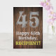 Dieses Western-Aussehen und Country-Look Geburtstagskartendesign mit einer großen rustikalen Look-Nummer "45", der Meldung "Happy 45 th Birthday", einem personalisierten Namen und einem Imitat/Imitation Holz Getreide inspirierte Look-Muster Hintergrund. Die Innenseite verfügt über eine benutzerdefinierte Geburtstagsgrüßbotschaft oder könnte gelöscht und leer verlassen werden, wenn eine Nachricht von Hand geschrieben werden soll. Eine individuell anpassbare Geburtstagskarte wie diese kann zum Feiern des fünfundvierzigsten Geburtstages von jemandem verwendet werden. [~Z0000469]