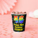 Dieses aufregende und farbenfrohe Geburtstagszeitpapier-Cup-Design zeigt eine große Zahl "46" mit einem inspirierten Regenbogenspektrum-Farbverlauf, zusammen mit der Meldung "Happy 46th Birthday" und einem editierbaren Namen. Der Hintergrund weist ein buntes Farbmuster verschiedener Musiknoten und Symbole mit verschiedenen Farben und Größen auf. Lebhafte, farbenfrohe Papiertücher wie diese könnten sich bei einer Geburtstagsfeier zum Feiern des sechsundvierzigsten Geburtstages von jemandem amüsieren. [~Z0000541]