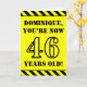 Auf der Vorderseite dieses Aufmerksamkeits- und lustigen Geburtstagskarten-Designs steht ein individualisierbarer Name und die Meldung "YOU’RE NOW 46 YEARS OLD!" in schwarzem Schablonentext auf gelbem Hintergrund. Die Vorderseite weist auch ein auffälliges schwarz-gelbes Streifen-Muster an den oberen und unteren Rändern auf. Im Inneren befindet sich eine bearbeitbare Geburtstags-Grußnachricht, oder man könnte sie löschen und leer verlassen werden, wenn eine Nachricht von Hand geschrieben werden soll. Eine individuell gestaltbare Geburtstagskarte wie diese könnte eine lustige Art sein, eine Nachricht zum Feiern des sechsundvierzigsten Geburtstages von jemandem zu senden. [~Z0000413]