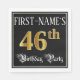 This ornate and fancy birthday themed paper napkin design feature an editable name and the message "46th Birthday Party". The large number "46th" has an imitation/falsch gold-inspirred coloring pattern, and the words "Birthday Party" are in elegant script-style text. The background is colored black by default (although it can be customized). Elegant, opulent paper napkins like this might be useful to have at a birthday party/celebration being held to honor somebody's 46th birthday. [~ Z0000565]