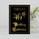 An der Vorderseite dieses luxuriösen, eleganten, gefoliten 46. Geburtstagsfeier-Einladungs-Designs steht die Nachricht "46. Geburtstagsfeier" in opulentem Schriftzeichen-Text. Es hat auch einen personalisierten Namen. Der Hintergrund der Vorderseite ist standardmäßig schwarz gefärbt (obwohl er auf eine andere Farbe angepasst werden kann). Auf der Rückseite finden Sie personalisierte Details zum Ereignis, wie Datum, Uhrzeit, Ort und andere relevante Informationen. Extravagante, verzierte, individuell gestaltbare Einladungen wie diese können genutzt werden, um die Gäste zu einer Geburtstagsfeier einzuladen, die zur Ehrung des 46. Geburtstages von jemandem veranstaltet wird. [~Z0000589]