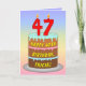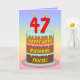 This fun and colorful birthday greeting card design features a cartoon-style depiction of a three-tier birthday cake having numeral-shaped candles on top showing the number “47“, along with the message “HAPPY 47TH BIRTHDAY,”, and a custom recipient name. The background of the front features a multi-color pastel rainbow spectrum inspired gradient pattern. The inside features a customizable birthday greeting message, or could perhaps be cleared and left blank if a message is to be written by hand instead. A joyful, editable birthday greeting card like this might be used to celebrate somebody’s forty-seventh birthday. [~Z0000625]