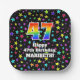 This fun and colorful birthday themed paper plate design features a large number “47” having a rainbow spectrum gradient inspired pattern. It also features the message “Happy 47th Birthday,”, and a personalized name. The background features a colorful pattern featuring many star shapes with different colors and sizes. Paper plates like this might be used at a birthday party held in celebration of somebody’s 47th birthday. [~Z0000582]