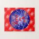 Ein Spaß 4. von Juli-Puzzlespiel umfaßt mit den roten und weißen Feuerwerken, tiefer blauer Kreis auf einem hellen roten Hintergrund.