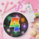 Diese farbenfrohe, fröhliche und lustige Papierplatte zeichnet sich durch eine große Zahl "4" aus, die ein inspiriertes Muster des Regenbogenspektrums enthält. Es zeichnet sich auch durch ein lebendiges und aufregendes Feuerwerk inspiriert. Der Hintergrund ist schwarz. Teller wie diese können bei einer Feier zum 4. Geburtstag, 4. Geburtstag oder 4. Geburtstag von jemandem verwendet werden. [~Z0000490]