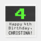 Dieses nerdige und lustige Geburtstagsthema Papier Serviette Design bietet eine große grüne Retro-Computerspiel-Stil Nummer "4" auf einem schwarzen Hintergrund. Es enthält auch die Geburtstagsgrüßbotschaft "Happy 4th Birthday", und einen personalisierten Namen. Spaß, bearbeitbare Papierservietten wie diese können bei einem Party benutzt werden, das zum 4. Geburtstag von jemandem gefeiert wird. [~Z0000404]
