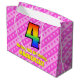Dieses fröhliche und lustige 4. Geburtstagsgeschenk-Geschenktütendesign zeichnet sich durch eine große Zahl "4" aus, die durch das Aussehen eines Regenbogenspektrums inspiriert ist. Es enthält auch die Meldung "Happy 4th Birthday", und einen bearbeitbaren Namen. Der Hintergrund weist ein lustiges Muster aus dunkelrosa und hellrosa Streifen auf, die liebende rosa Herzformen enthalten. Eine Geschenktasche wie diese kann verwendet werden, wenn Geschenke oder Geschenke verpackt werden, um jemandes vierten Geburtstag zu feiern. [~Z0000414]