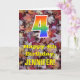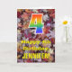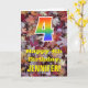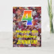 Die Vorderseite dieser bunten, naturlich inspirierten und rustikalen Geburtstagskarte zeigt eine große Zahl "4" mit einem Regenbogenspektrum inspiriert Muster. Es enthält auch die Meldung "Happy 4th Birthday", und einen personalisierten Namen. Die Vorderseite zeigt einen Hintergrund mit rustikalen gefallenen Herbstblättern. Im Inneren befindet sich eine individuell angepasste Geburtstagsgrüßbotschaft, oder man könnte sie löschen und leer verlassen werden, wenn eine Nachricht von Hand geschrieben werden soll. Eine solche individuelle Geburtstagskarte könnte eine lustige Art sein, Geburtstagwünsche an jemanden zu senden, der seinen vierten Geburtstag feiert. [~Z0000384]