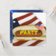 Hotdog auf einem patriotischen Teller mit Senf für den 4. Juli Party.