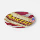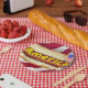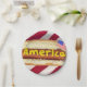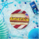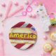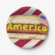Hot Dog auf amerikanischer Fahne mit Senf und winziger Flagge für das 4. Juli Party
