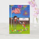 Glücklicher 4. Juli Papier Grußkarte mit einem Paar schmücken ihren Hinterhof, indem sie patriotische Bollen auf einem Zaun hängen, während Feuerwerk explodieren in den Himmel. Art, Bild und Vers Copyright © Shoaff Ballanger Studios, 2022.