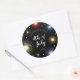 Mit diesem schwarzen Nachthimmel-Aufkleber können Sie Ihr Party zum Unabhängigkeitstag ergänzen. Der Text im Skript sagt "4. Juli", umgeben von weißen Sternen, farbenfrohen Feuerwerken und Orten, um mit Ihrem Familiennamen und Datum/Jahr personalisieren.