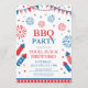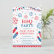 Am 4. Juli feierliche Grillabend Party Einladung mit Rahmen, Fahnen und Feuerwerk abgeschieden auf weißem Hintergrund. Design for American Independence Day Einladungen. Anpassbare Typografie in Rot und Blau.