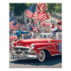 Entwerfen Sie ein Bild mit einer Vintag inspiriert Parade am 4. Juli mit Oldtimer, Marschbändern und Zuschauer in Retrobekleidung.