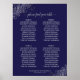 Dieses schöne 4-Tisch Hochzeitsstühle Diagramm beinhaltet Tischbelegungen für 40 Gäste, mit 10 Personen an jedem Tisch. Das Design ist einfach und dennoch elegant mit einem grauen Text auf marineblau Hintergrund und einem silbernen Filigree aus blorfarbenem Imitat in den Ecken und einem extravaganten Schriftzeichen mit dem Titel "Finde bitte deinen Tisch". Raffiniert und elegant.