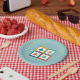 Eine grafische Darstellung von 4 Weihnachtsbäumen, gefliest in einem Posterstil. Retrofarben - gelb, orange, blau und grün. Niedlich und festlich.