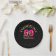 Bold 50 and Fabulous 50th birthday party Paper Plates with gold and pink typography against a black background. Ideal for glam fiftieth birthday celebrations. Add your name for that extra special touch.