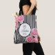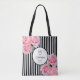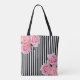 Eine Tasche für eine 50. Geburtstagsfeier. Klassische schwarz-weiße Streifen als Hintergrund. Mit mädchenhaften und femininen rosa Rosen als Dekoration. Ein Rahmen mit dem Text: 50 und Fabulous und Vorlagen für Name und Datum auf der Vorderseite. Zurück: Nur Streifen und Rose, kein Text.