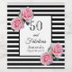 Ein Label für eine 50. Geburtstagsfeier. Klassische schwarz-weiße Streifen als Hintergrund. Mit mädchenhaften und femininen rosa Rosen als Dekoration. Ein Rahmen auf der Vorderseite Mit dem Text: 50 und Fabulous und Vorlagen für Name und Datum.