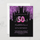 Eine mädchenhafte und weibliche 50 & fabelhafte Geburtstagsfeier. vorne: Ein schicker schwarzer Hintergrund. Dekoriert mit dunklen lila Imitaten Glitzer Tropfen, Farbe Tropflook. Personalisieren und fügen Sie einen Namen und Party-Details hinzu. Der Name wird mit einem handgeschriebenen Stilskript geschrieben, mit lila, hellen Buchstaben. Alter: 50 Jahre mit einem angesagten Schriftart im Ballonstil. Zurück: Normales Postkartendesign