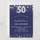 Eine moderne, stilvolle und glamouröse Einladung zu einer 50. Geburtstagsfeier. Ein marineblau-blauer Hintergrund, mit Imitaten verziert, die silberne Sterne tragen. Personalisieren Sie Ihren Namen und Ihre Party-Daten und fügen Sie diese hinzu. Nummer 50 wird mit einem Schriftart im Ballonstil geschrieben.