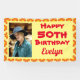 Feiern Sie ihren besonderen Tag mit diesem 50. Geburtstag Orange Blume Foto Banner. Personalisieren Sie es mit ihrem Foto, Namen und Alter. Dieses farbenfrohe Blumenbanner mit orangefarbenen Blüten und einem fett gelben Hintergrund mit hellrotem Text.