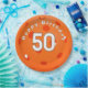 Nah-up eines orangen pickleball für einen 50. Geburtstag. Alle Texte können geändert oder gelöscht werden.