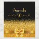 Elegant, klassisch, glamourös und weiblich für einen 50. Geburtstag. Ein goldfarbenes Band und Bogen mit goldenem Glitzer und Funkeln, ein bisschen Bling und Luxus. Schwarzer Hintergrund. Vorlagen für den Namen, das Geburtsdatum und das Datum des Jahrestages und die Altersnummer. Goldene Buchstaben.