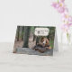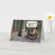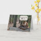 Ein Bär mit seinen Pfoten, die sich auf einem Holztisch in einem Wald für seinen 50. Geburtstag ruhen, ist humorvoll Posen.