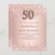 Eine moderne, stilvolle und glamouröse Einladung zu einer 50. Geburtstagsfeier. Eine Rose goldener Hintergrund mit Rose Gold Tropfen, Farbe Tropfen aussehen. Der Name ist mit einer modernen dunklen Rose goldfarbenen handgeschriebenen Schreibschrift geschrieben. Personalisieren Sie Ihre Party-Daten und fügen Sie sie hinzu. Nummer 50 wird mit einem Schriftart im Ballonstil geschrieben, Skript.