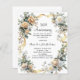 Ein weißer Hintergrund. Weiße und gelbe Blumen und ein goldenes Band. Personalisieren und fügen Sie einen Namen und Details. 1 Blatt = 1 Einladung mit Druckkante bis Kante.