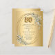 Ein Imitat goldener Hintergrund. Ein ovaler goldener Rahmen, der mit einer schludrigen Vegetation geschmückt ist. Personalisieren und fügen Sie Ihre Namen, Details. Schwarzer Text. 1 Blatt = 1 Einladung mit Druckkante bis Kante.