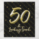 Leicht zu individualisieren goldelegantes Skript "50 & Looking Good" Geburtstagsweinetiketten für jede 50. Geburtstagsfeier. Der personalisierte Name im Hintergrund ist ein frisch moderner Typografie-Look, der gut aussieht.