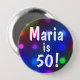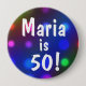 Ein festliches buntes Knopf-Button mit einem Hintergrund bokeh der bunten Partylichter und des Textes sagt: "Maria ist 50!" Ändern Sie zu jedem möglichem Namen und zu irgendeinem Alter leicht. Einfach, dieses niedliche Abzeichen besonders anzufertigen und mit irgendeinem Alter oder Name, etc. zu personifizieren. Ein glückliches und Spaßknopf-Button für Kinder, Teens und Männer und Frauen jedes möglichen Alters von den Babys, Kinder, Teens zu jenen spezieller Geburtstagsmeilenstein über dem Hügel altert!